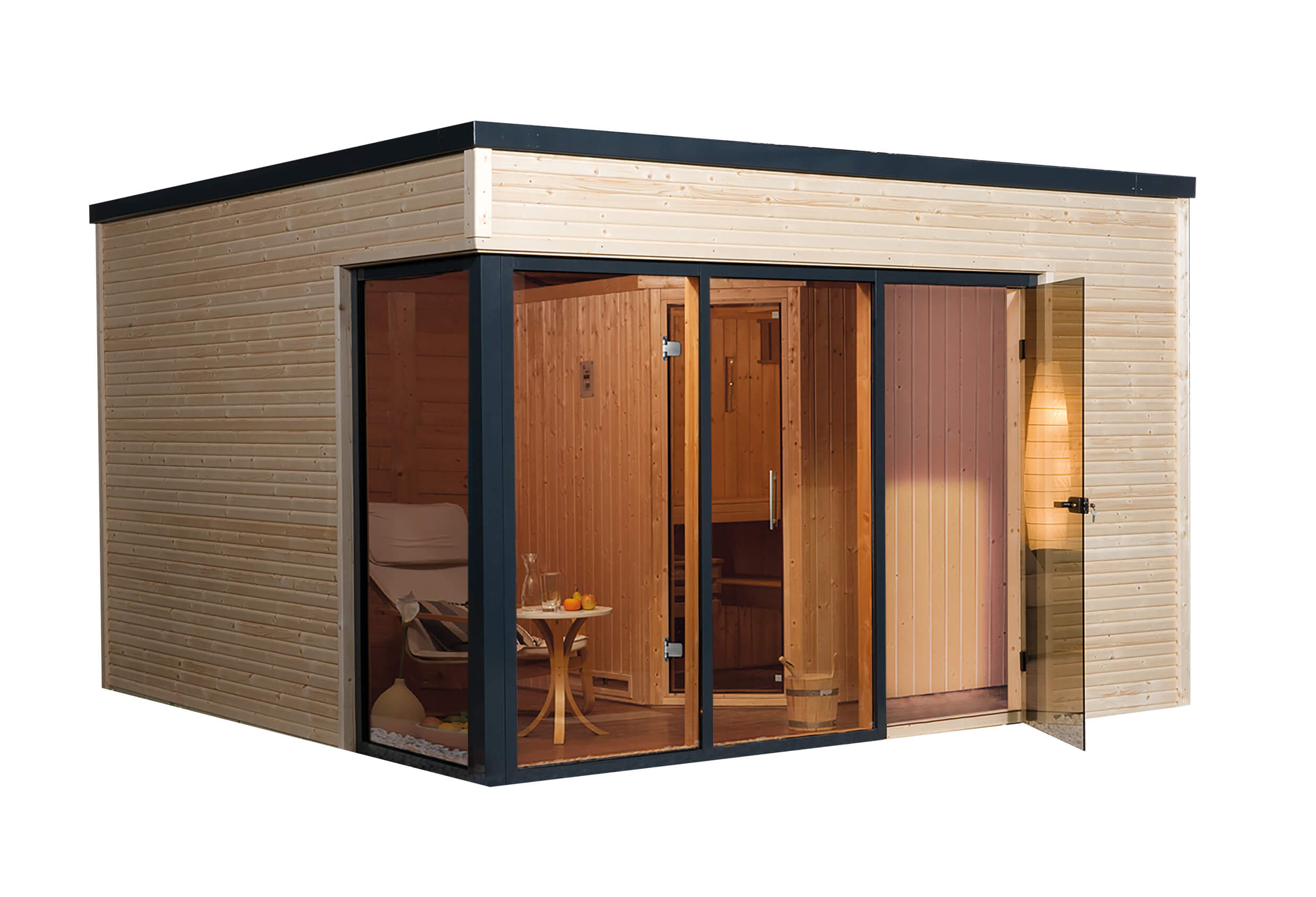 Das Saunahaus Cubilis, aus 45 mm starke Blockbohlen/ Fichtenholz, isolierte