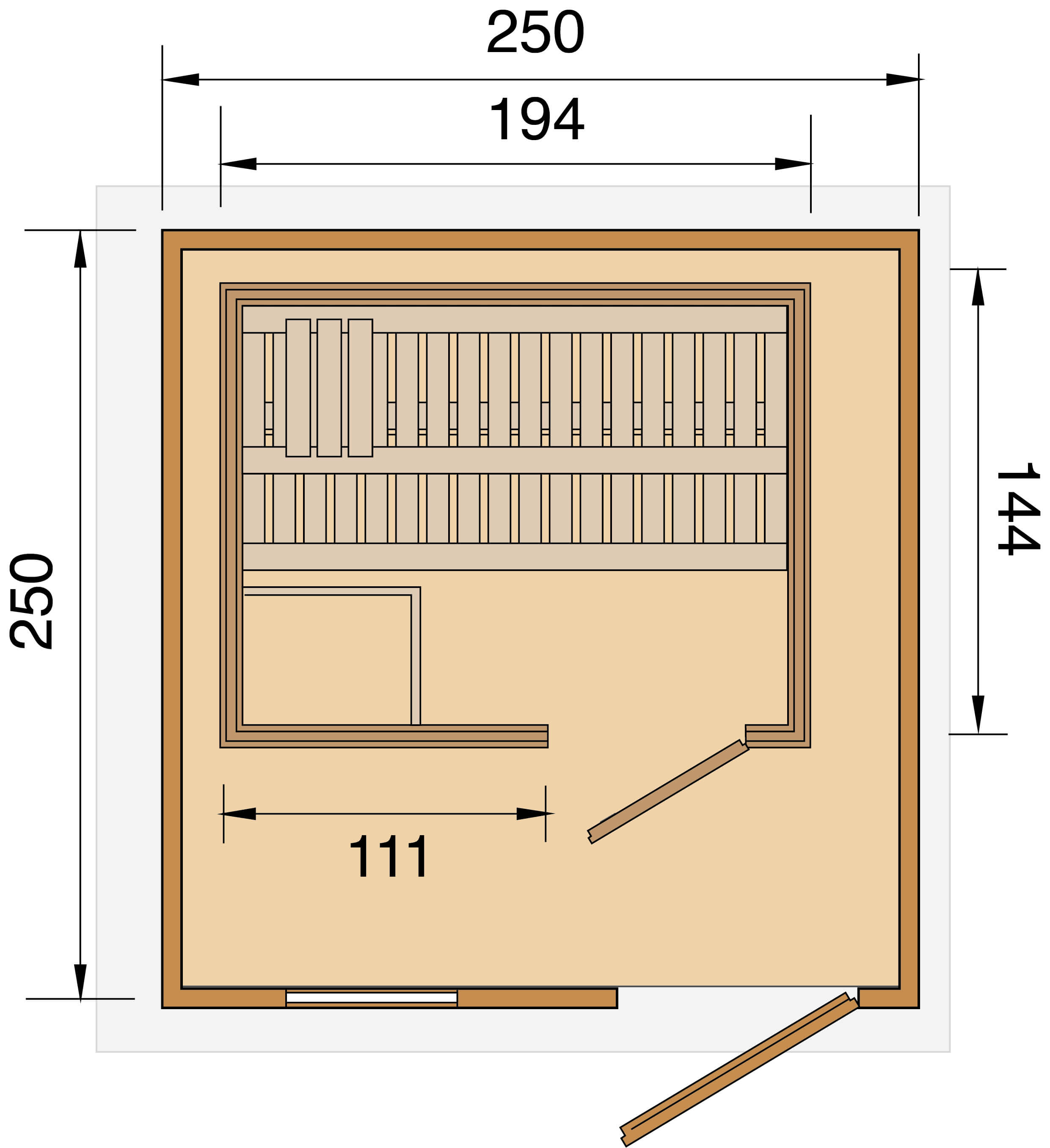 Im Saunahaus befindet sich eine Weka Sauna 194 x 144 cm, isolierte Ausführung( Halmstad). Als Bausatz